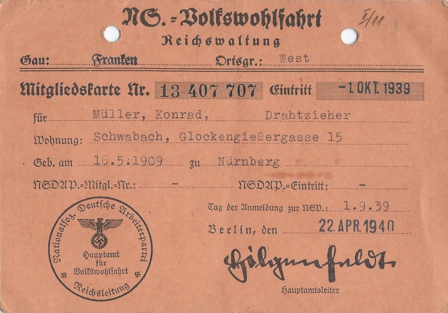x936 - NS-Volkswohlfahrt Gau Franken - Schwabach, Mitgliedskarte