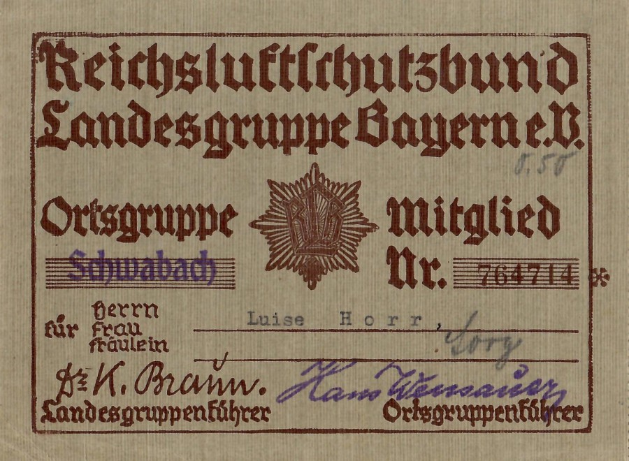 x1013 - Reichsluftschutzbund Ortsgruppe Schwabach, Mitgliedskarte 1937